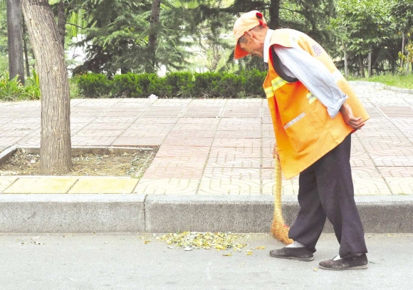 仲秋时节,地上的落叶逐渐多了起来。环卫工人介绍,为了保持路面干净,他们一天至少要清扫四遍。图为,27日下午乐园小区附近环卫工人在清。