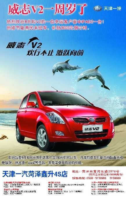 第一大喜事:7、8、9三个月购威志V2赠送500元加油卡,并且有抽取ipad2和普吉岛旅游的机会。菏泽鑫升4S店在8月份购V2的客户中就有这么一位非常幸运的朋友,当时提车时以菏泽鑫升团购的价格购买威志V2豪华版车,现在他有那么幸运的被天津一汽厂家抽中ipad2一台。相信9月份购买威志V2的客户一样有这样的幸运客户,而且我们相信普吉岛旅游的幸运者就在菏泽鑫升店7、8、9三个月购买V2的客户当中。