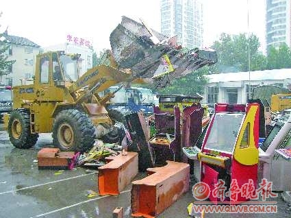 伴随着两辆铲车的轰鸣声,376台赌博游戏机被碾得粉碎。28日中午,在治安支队四大队驻地广场,济南市公安局将近四个月来在铲除涉赌“黑窝点”专项行动中查获的赌博游戏机进行了集中销毁。