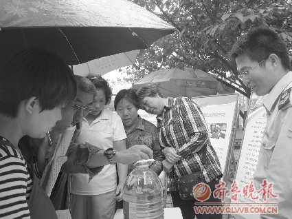 上午10点,在云霄路的社区管理服务中心,市食品药品监督局市南分局的工作人员现场为市民讲解如何鉴别食用油的质量,30多位居民前去咨询。食用油专家从无任何标识的大桶中倒出了一杯油,市民罗女士拿起油闻了闻,“这是什么油,咋没有味道?”罗女士问。“您手里拿的是劣质油,添加过吸附剂后变得没有味道了。”专家说着,递上另外一个装有安全食用油的瓶子,“嗯,这瓶油有香气。”罗女士闻过后说。