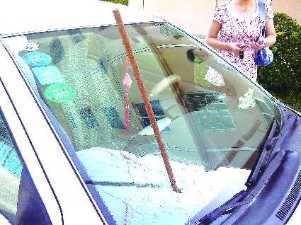 “只觉得有三个东西飞了下来,然后就听到砰砰的声音。”张女士介绍说,当时一共飞下来三根钢筋棍,其他两根撞上车子后弹到了路边,另外一根从副驾驶座前的挡风玻璃上直接插了进来,一直深入到副驾驶座的工具盒里。当时吓得她脸色煞白,心跳加速,好一会才缓过劲来。