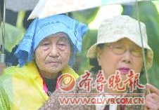 两位老人冒雨参加大典。