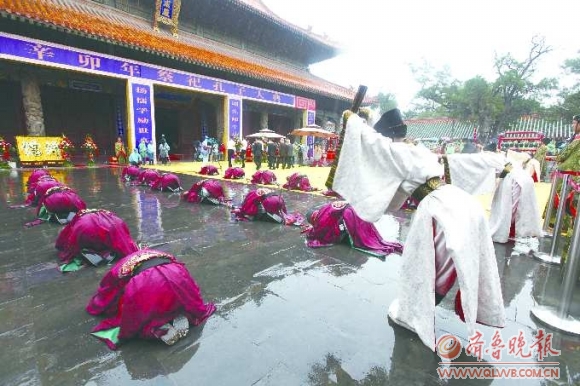 随着司仪悠扬的呼声,身着古服的舞者虔诚地跪伏在雨中,台下的观众也一齐面向大成殿鞠躬。他们神情专注、肃穆,怀着崇高的敬意,缅怀先师孔子。