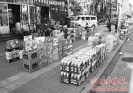 27日上午10点,在西海路上,许多商家为了吸引顾客把店里的酒水摆到人行道