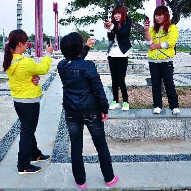 自述:四个女孩子各自用照相机为对方拍照。