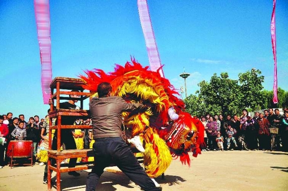 自述:舞狮子者不小心从架子上掉了下来,失手了!