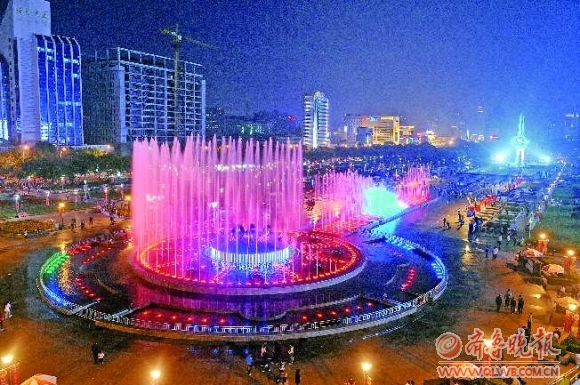 ▲历经四个月整修,泉城广场的荷花音乐喷泉、方形池中喷泉、泉标喷泉和采光井喷泉10月1日“回归”,将为市民献上视觉盛宴。图为昨日试喷时,LED灯将灵动的喷泉映照得流光溢彩。 本报记者 张中 摄