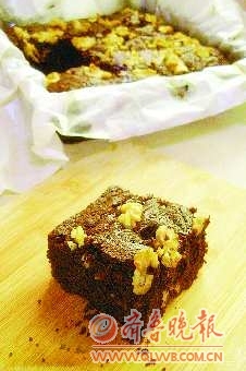 材料: 无盐奶油150g、细砂糖100g、黑巧克力150g、鸡蛋3个、低筋面粉150g、可可粉20g、泡打粉1/2t、小苏打粉1/4t、碎核桃仁50g
