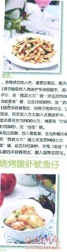 2、将杏鲍菇放入微波炉专用容器中,调入橄榄油拌匀,再放入微波炉中,按“微波炉火力”键一次选定P100火力,再旋转“时间重量自动菜单”键,设定时间30秒,按“启动”键。