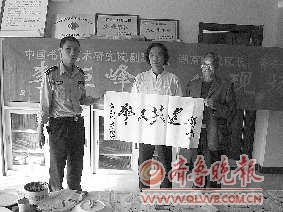 芝罘区世回尧派出所邀请中国书画艺术研究院副院长李钜峰先生走进世秀新区,义务为社区老党员、优秀工作者创作了20余幅书法作品,受到了社区居民的欢迎。本报记者 毛旭松 摄