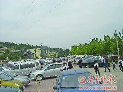 在月亮湾景区入口处,约300个停车位已经停得满满当当。门口外不远处的一片空地上,也停满了车辆。在月亮湾都市庄园内,一处高尔夫球场被辟为临时停车点,可同时供200辆车停放。