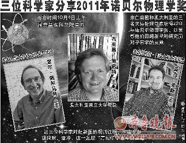 据新华社斯德哥尔摩10月4日电 瑞典皇家科学院4日宣布,将2011年诺贝尔物理学奖授予美国科学家索尔·佩尔马特、拥有美国和澳大利亚双重国籍的科学家布莱恩·施密特以及美国科学家亚当·里斯,以表彰他们在天体物理学方面的卓越研究成果。