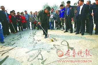 10月5日,在邹城市文化广场,参加地书大赛的老人正书写地书。当日是九九重阳节,孟子故里邹城市举行首届老年人地书大赛,百余名老人以大地为纸,以清水为墨,在快乐书写中欢度重阳节。