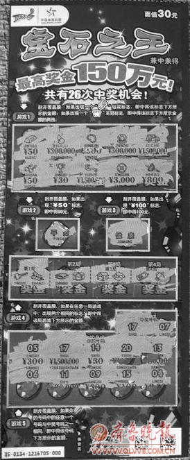 星小奖,觉得不过瘾,就又买了些来刮,仍旧没有大的收获。A先生心有不甘,看看还剩了三十元钱,索性买了一张新上市的“宝石之王”。结果就是这种他先前不看好的大面值票种,让他有了一个天大的收获:在该张票的第5种也是最后一种游戏里,中奖号码是17、07,而刮开的第2个号码是17,下面标示的中奖金额是1500000!他怀疑自己数错了,赶紧看看阿拉伯数字下面的汉语拼音标注,一百五十万!
