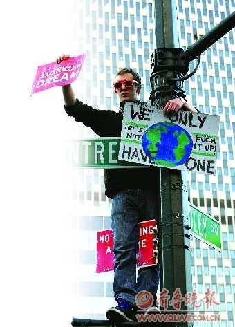 10月5日,一名美国人在纽约曼哈顿的一标志杆上举牌抗议。 新华社发