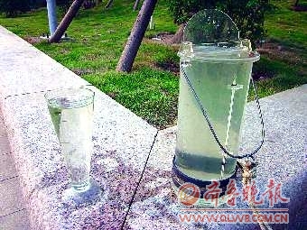 紧接着,孙凯拿着取样器、量杯和长绳来到冒出“黑水”的地方,进行实地检测,吸引了几名市民驻足观看。孙凯先用取样器从“黑水”中取样倒入量杯,市民近前一看竟十分清澈,仔细一闻也没有异味。接着,孙凯又从平常的“绿水”中取样,两相对比,“绿水”的杂质竟比“黑水”还要多,气味也没有更清新,市民不禁感到有些不解。