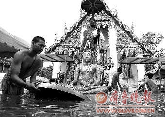10月7日,在泰国大城的猜瓦达纳兰寺,僧人在洪水中收拾物品。大城是泰国著名古都,城内有王宫和寺院等古迹,1991年被列入《世界遗产名录》。 新华/路透