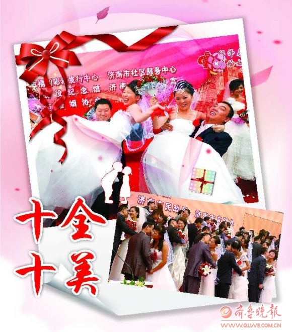“十全十美”,10月10日上午10时许,“红色浪漫、百合之缘”2011年济南福彩大型公益集体婚礼在济南战役纪念馆广场举行,60对新人牵手迈入婚姻殿堂。 本报记者 左庆 周青先 摄