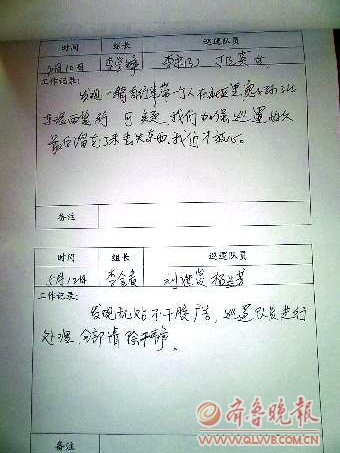 就在距无影潭社区不远处的北坦街道北关社区,类似的义务巡逻队每天都在辖区走动。社区居委会里有三四个档案盒,里面装满了这支民间队伍的巡逻记录:发现乱贴不干胶广告,巡逻队员进行清理,全部清理干净;一个骑自行车的带着一个人在小区里东张西望,形迹可疑,我们加强巡逻,他们溜走了,未丢失东西……每条记录都清晰在目。