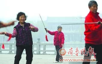10日,在济南大明湖新区,几位市民正在雾气中练剑,远处的庙宇若隐若现。医务人员提醒,为避免因雾致病,市民应减少外出时间,尤其是呼吸道疾病患者不宜外出晨练。有晨练习惯的市民,遇大雾可以改为室内活动。