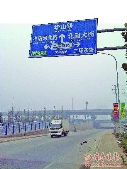 而在滨河南路、小清河北路与将军路的交叉口附近,两条路上的交通指示牌都将前面的将军路指示为“二环东路”。最为明显的是,在小清河北路与将军路交叉口东侧的红绿灯上方便有标着“二环东路”字样的大号指示牌,而南北两侧相距不远又各有一个写着“将军路”的路标。