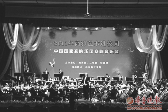 日前,由教育部、文化部、财政部联合主办的“2011高雅艺术进校园”活动正式启动,在我省高校中,中国国家交响乐团走进山东英才学院专场音乐会在该院大学生活动中心隆重举行。据介绍,“高雅艺术进校园”活动由教育部、文化部、财政部主办,这项活动以先进文化为导向,以多彩文艺形式为载体,将高雅的艺术带进了校园,丰富了大学生的文化生活,受到了大学生们的热烈欢迎。2011年高雅艺术进校园活动在山东省仅在山东大学、山东师范大学、山东艺术学院和山东英才学院举行,山东英才学院是此次活动的第一站,演出在一曲欢快激扬的《第一交响序曲》中拉开序幕。(刘波)