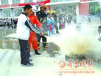9日下午1时30分,威海市崮山中学模拟教学楼失火情景,举行消防演练,增强学生的应急反应能力。 本报记者 王帅 通讯员 侯善坤 摄