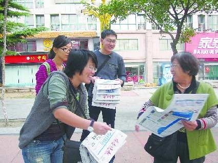 10日,在为救助身患白血病的大学生组织的义卖报纸活动中,不少平日里习惯网上看新闻的年轻人,也毫不犹豫地掏钱买报纸,为血癌大学生献上一份爱心。
