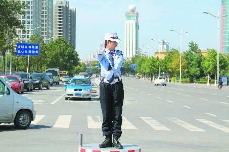近日,临沂交警直属一大队在市区设置6个形象示范岗,18名女子护卫队队员分别在蓝天岗、桃源岗等处执勤,担负路口执勤指挥任务。