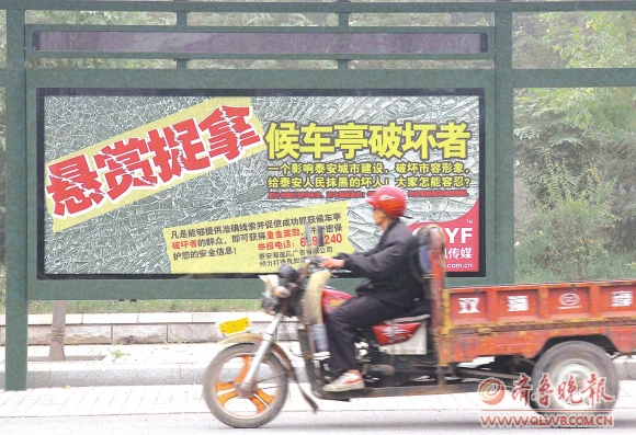 10日,在灵山大街西段,崭新的公交候车亭灯箱里安装了一则“捉拿候车亭破坏者”的广告。据悉,张贴“缉拿令”的是负责改建泰城旧公交站牌的公司,他们一直被破坏公交候车亭的现象所困扰,称目前已经有50多块候车亭玻璃被砸坏,公司损失惨重。由于迟迟找不到破坏者,他们就采取这种方式寻找线索。