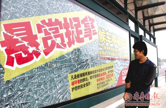 近日,在灵山大街西段,崭新的公交候车亭灯箱里张贴了一则“捉拿候车亭破坏者”的广告。张贴”缉拿令“的是负责改建泰城旧公交站牌的泰安海逸风广告有限公司,而张贴原因是自从改建以来,新式候车亭连续遭黑手,被砸玻璃达五六十块,价值十余万元。多方查找未果,只能采取这种方式借助市民的力量来“缉拿凶手”。