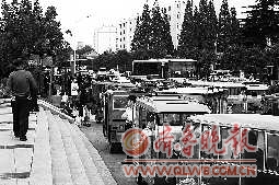 10月10日下午,多辆三轮出租车在日照市火车站前的马路上排起长龙等待载客,造成火车站前道路拥堵,给过往车辆和市民造成不便。