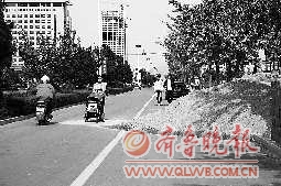 10月10日,在日照市烟台路上一处工地附近,施工用的沙料被堆放在了马路上,给行人与车辆的通行造成不便。
