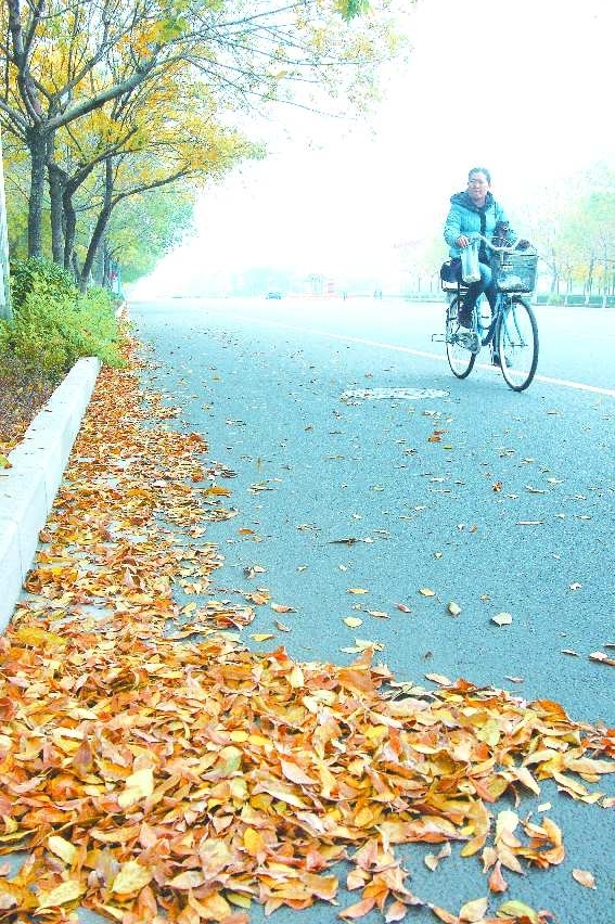 10日,市民身着棉衣骑行在铺满落叶的府前大街上,形成了一幅浓的别致画面。深秋将至,气温降低,街头展现出一片深秋的氛围。据气象部门预报,12日东营气温将可能迎来小幅下降。