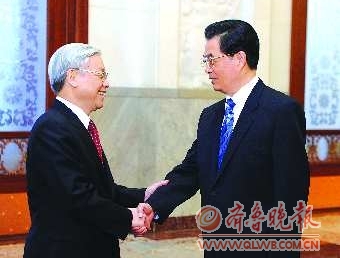 胡锦涛与越共中央总书记阮富仲举行会谈。新华社发