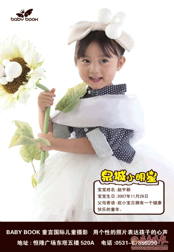 泉城小明星上报栏目,展现孩子童真的笑颜,表达父母的祝福与期望,同时具有纪念意义。本栏目由金色童年独家推出,具体刊登事宜请与金色童年策划部联系。