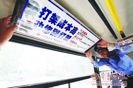 11日,黄岛公安分局民警在公交车上安装“打架成本高,劝您别打架”的宣传牌,列举打架的成本,用这种形式“劝说”乘车的市民在生活中不打架。