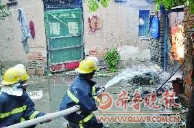 老王担心煤气罐爆炸,不敢上前救火,急忙拨打119电话报警。消防到场时,厨房屋顶已经烧塌,瓦砾下的柴草还在猛烈燃烧,厨房内有一个煤气罐,阀门处已经损坏发生泄漏,罐顶附近不停喷射出火焰。消防队员立即使用水枪灭火,同时对煤气罐进行喷水降温。由于煤气罐阀门已经损坏无法关闭,两名消防官兵在水枪的掩护下将燃烧中的煤气罐抬出,转移到空旷地带,将罐体整个放置在水渠内,才排除了险情。