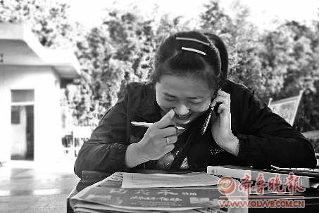 11日,王女士一边听电话那头“指挥”,一边填写报名表。 记者 张照朋 摄