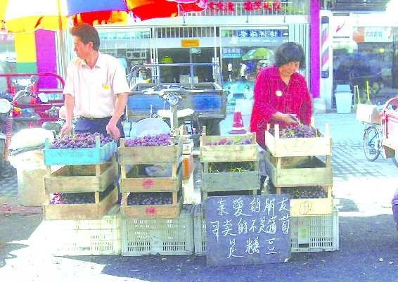 作品描述:小区市场里,一卖葡萄的老板别出心裁地打出这样的广告语。