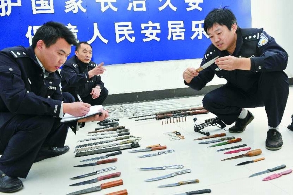 10月11日,定陶县公安局治安大队民警正在清点收缴的各类非法枪支和管制刀具。自公安机关开展“治爆缉枪”专项行动以来,定陶警方已收缴各类非法枪支65支,管制刀具356把,子弹53发,有效消除社会治安隐患。 本报通讯员 朱建英 摄影报道