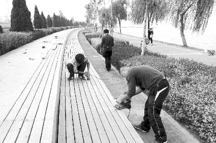 11日下午,滨河景区沂蒙广场附近,市园林局小埠东管理所的工作人员在用砂光机、磨光机打磨木质坐凳。工作人员称,这次打磨主要是为了磨掉木凳表面的木刺,使市民坐在木凳上休息时不会被木刺刮伤衣物。打磨结束之后,他们还会在木凳上刷防腐剂,再刷两层清漆。所有事项完工大约需要一星期时间。 记者 娄雅哲 摄影