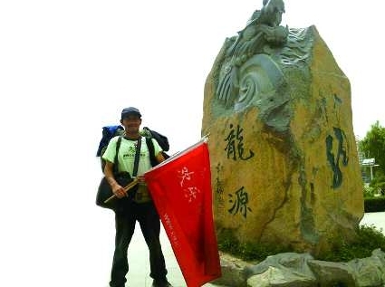 “徒步万里走西部,冲刺黄河源头”是费玉玺徒步的主题。上一次与记者交流是在2008年,QQ名称是“千里走单骑”。2011年10月4日,费玉玺现身沂河边,急行军式的背包、密密匝匝写满人名的小红旗和有些斑白的胡须,“行者,就是走在路上,看我这身装扮,懂的旅行的人就应该知道我是资深驴友。”费玉玺说。