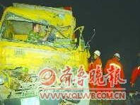 10日,滕州市姜屯镇张园村附近一辆货车与前车发生追尾,一名驾驶员被困。滕州市消防官兵将驾驶座底部剪断拆除后将被困人员救出。