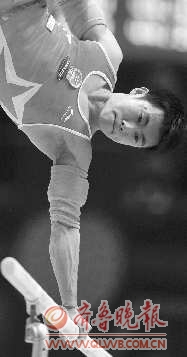 10月14日,中国选手滕海滨在男子个人全能双杠比赛中。当日,在东京举行的2011世界体操锦标赛男子个人全能决赛中,日本选手内村航平以93.631分的成绩夺得冠军,德国选手博伊·菲利普以90.530分的成绩获得亚军,日本选手山室光史以90.255分的成绩获得季军,滕海滨以87.031的总分列第18位。