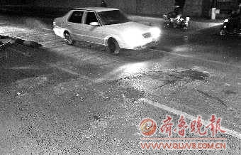 ▲事发现场,被撞断的限高杆长约15米。 本报记者 徐延春 摄死者血迹被人用土掩盖。 本报记者 徐延春 摄