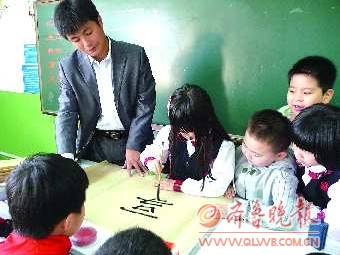 日前,在山师附小二年级三班的教室里,山东师范大学教师、中国书法家协会会员吕文明正在指导学生学写毛笔字。今后,该班将定期邀请书法家为孩子们讲授软笔和硬笔书法。