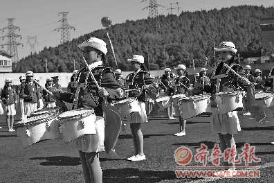 10月16日,德州市实验小学代表队在山东省鼓乐操比赛中荣获本次比赛金奖和最佳编排奖。图为实验小学代表队选手的精彩表演。