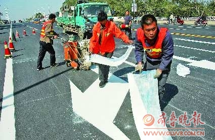 德州天衢西路路面的沥青铺设已经完成,17日,施工人员正在为路面规划新交通线,规范车辆的通行。