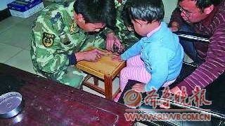 5岁女童将一小钢环套在手上把玩,却卡在中指上无法取下。16日,庆云渤海消防官兵将小钢环取下。图为消防员正在帮小女孩取下钢环。